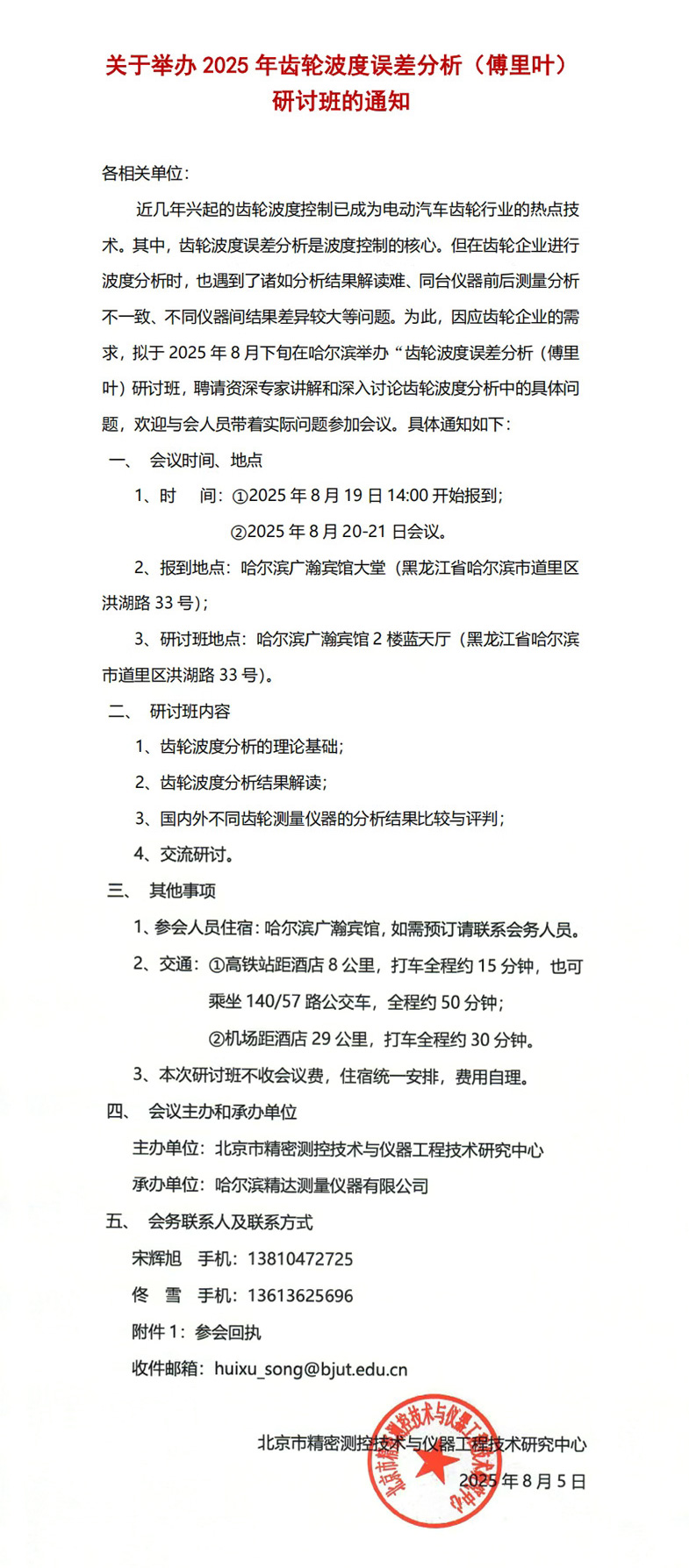 2025年8月19至21日,由北京市精密測(cè)控技術(shù)與儀器工程技術(shù)研究中心主辦,哈爾濱精達(dá)測(cè)量?jī)x器有限公司承辦的“2025年齒輪波度誤差分析(傅里葉)研討班”,將在哈爾濱舉辦,具體通知如下:
