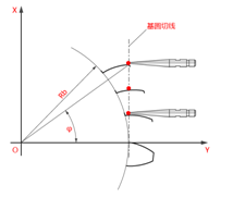 由于齒輪存在加工誤差,在用法向極坐標法測量時,測頭一直保持隨基圓的切向X軸方向做直線運動,如圖1-1所示。但實際測量時測球會隨著齒面誤差相對擺動,實際被測點測量展長與理論展長差值即為齒面偏差。