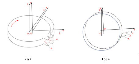 齒輪測量是一個動態測量過程,即齒輪繞回轉中心O旋轉,測頭沿切向X軸直線運動。由于安裝偏心,齒輪的幾何中心與回轉中心O不重合如圖1-2(a)所示,直接引起被測點基圓半徑的變化如圖1-2(b)所示,由公式(1)可知,實際測量展長隨著基圓半徑的變化而變化,展長與展角不再是線性關系。但在實際測量過程中,測量動作保持不變,既而由測頭讀數直接計算齒面誤差,所得結果包含了安裝偏心引起的測量誤差,使得測量結果不夠準確。如圖1-2(b)所示,在沒有安裝偏心的情況下,被測點為A,安裝偏心后測量點為