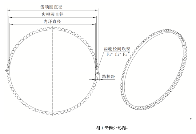 飛輪總成是汽車發動機啟動裝置中重要的一個部件,飛輪總成與離合器壓盤一并起到吸收振動,儲存能量的作用。而薄壁齒圈又是飛輪總成部分的一個關鍵零件,由于其壁薄,齒多,直徑大等特點(如圖1所示),能夠使飛輪總成的安裝結構緊湊,使用壽命長,在汽車啟動裝置中起到不可或缺的作用。然而由于這類齒輪形狀的特殊性,環形齒輪齒厚變化較大,外形尺寸變形較為嚴重,導致齒輪的精度和各項指標難于控制,這樣對傳動系統的精度有直接影響,同時對于精準的測量出其精度與參數也帶來了很大難度。