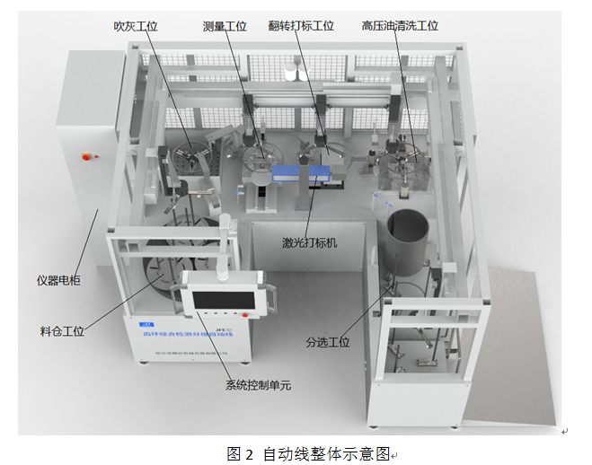 如圖4所示,自動線由料倉工位,吹灰工位,測量工位,翻轉打標工位,高壓油清洗工位,分選工位等組成。