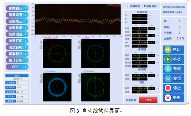 本文所述用于薄壁圓環類齒圈檢測自動檢測線,設計為多工位串行工作的方式,能夠實現快速裝夾工件,測量,打標,噴油清洗,分選等功能。該設備集合了計算機多點控制,多軸聯動,齒輪雙嚙測量,激光測量,傳感器判斷,電動,氣動,液壓等多項先進的技術,實現了被測工件自動上下料,零件相關誤差項檢測,方向判斷,翻轉打標,高壓清洗,分選等功能。工件從上料到分選出合格不合格整個過程僅需20秒,檢測時間是人工檢測時間的1/5,是三坐標檢測時間的1/10,而且三坐標與人工只能測量一些外形誤差,無法測量齒輪的精度誤差,而此臺自動線都可以滿足測量要求。圖2為自動線整體結構示意圖。針對該檢測線自主開發相應配套軟件詳情見圖3。