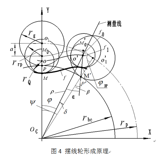 通過采集數據進行計算并與理論擺線、設計擺線的齒廓進行對比,得到擺線齒輪誤差。擺線齒輪測量的測頭軌跡曲線是理論短幅外擺線的等距曲線[4],它的形成原理如圖4所示。