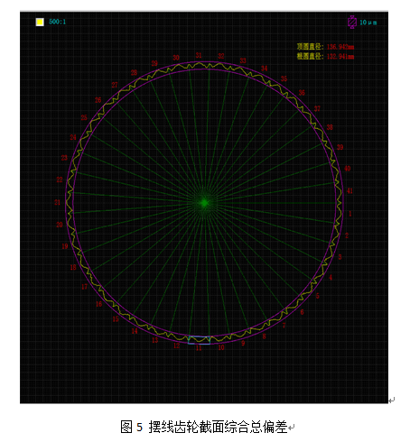 擺線齒輪測量儀通過由極坐標測量結合計算機密集采樣的測量原理,可以快速的得到擺線齒輪整周的徑向誤差曲線,處理得到截面綜合總偏差,截面綜合總偏差表示擺線齒輪整轉的誤差情況,實踐中可以快速判斷擺線齒輪的加工情況,結果如圖5所示。