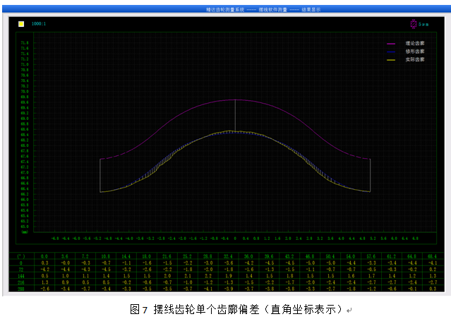以上第一種齒廓表達形式,在誤差曲線長度方向是擺線的等距嚙合角度,反應的是擺線齒輪的嚙合特性,而后一種齒廓表達形式,是轉化成直角坐標,清晰表達理論齒廓,設計齒廓及測量實際誤差曲線的關系,更緊密結合CAD數字化設計制造的評判。