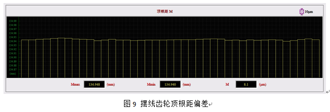 頂根距偏差和徑向跳動誤差由已經測量出擺線齒輪整周的數據,通過數據處理,可以得到全部頂根距誤差變動曲線和徑向跳動誤差變動曲線,測量偏差結果如圖9、10所示。